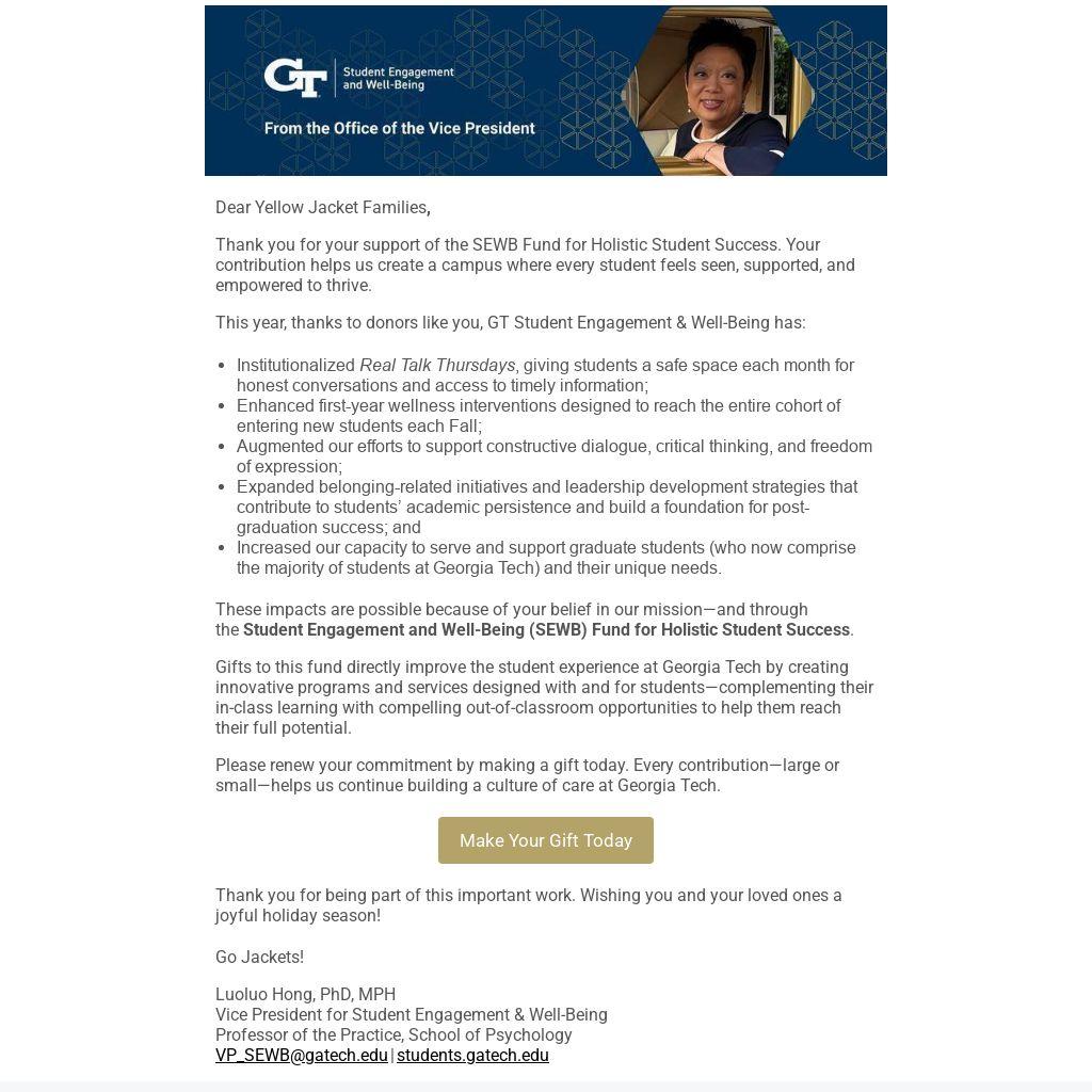 Please renew your commitment by making a gift today. Every contribution—large or small—helps us continue building a culture of care at Georgia Tech.