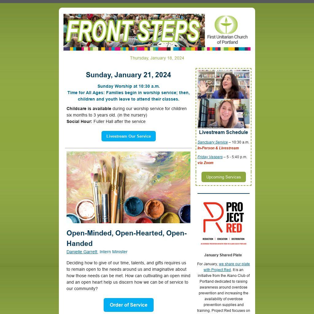 For January, we share our plate with Project Red. It is an initiative from the Alano Club of Portland dedicated to raising awareness around overdose prevention and increasing the availability of overdose prevention supplies and training. Project Red focuses on equipping bars, restaurants, strip clubs, entertainment venues, and community-based organizations with skills and supplies. We are grateful to Project Red for offering two training sessions here at First Unitarian this month.