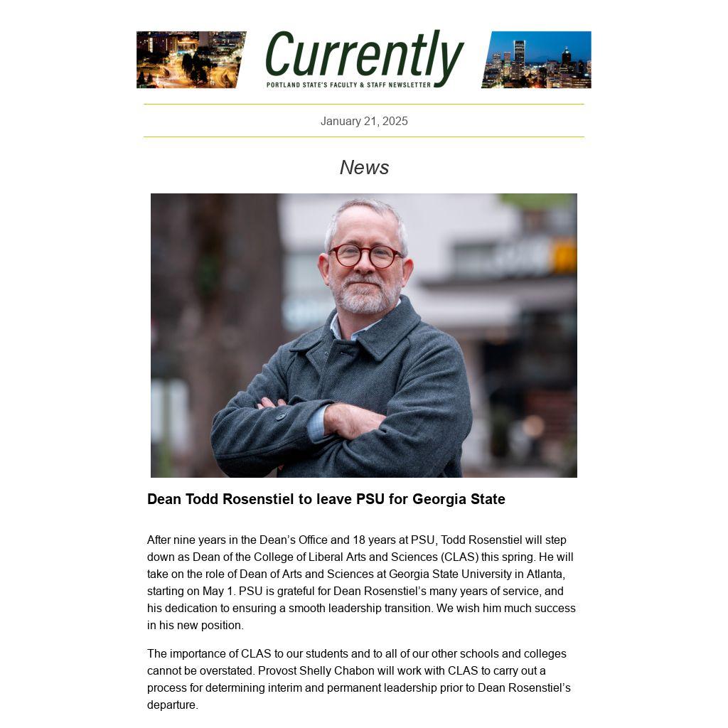 CURRENTLY is a weekly newsletter for the employees of Portland State University, published by University Communications. News items, events and accolades should be sent to currently@pdx.edu. Deadline is noon, the Tuesday before publication. See the Currently website for submission guidelines and schedule.
