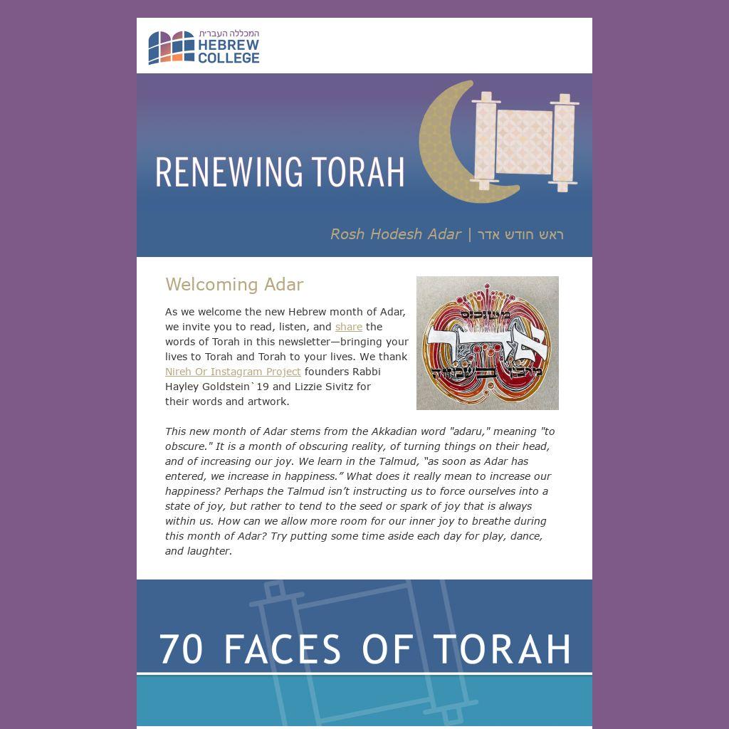 As we welcome the new Hebrew month of Adar, we invite you to read, listen, and share the words of Torah in this newsletter—bringing your lives to Torah and Torah to your lives. We thank Nireh Or Instagram Project founders Rabbi Hayley Goldstein`19 and Lizzie Sivitz for their words and artwork.