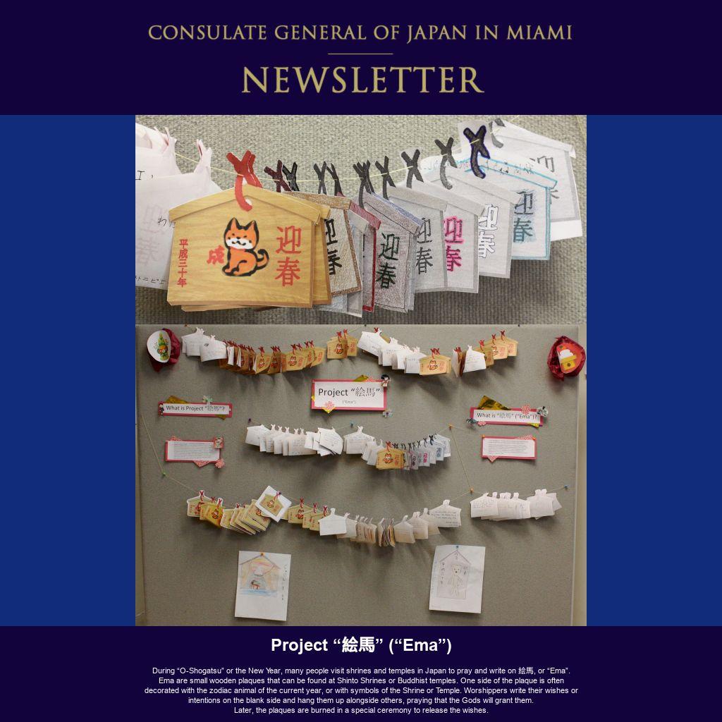 | In January, I hosted a New Year’s celebration at my official residence. Traditionally, the New Year is an important time in Japan, so I invited many esteemed Japanese living in Florida to attend the reception. At the residence, Shishi-Mai (Lion Dance) and Taiko drumming was performed by Fushu Daiko. Ikebana flower arrangements by Mieko Kubota, vice president of Ikebana International Miami, were displayed for the New Year. Guests were also able to enjoy osechi ryori (Japanese New Year’s food) throughout the evening. There were several Japanese New Year events throughout January. I hope you had a chance to enjoy them.