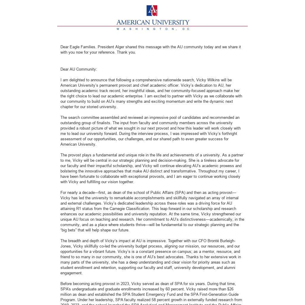 I am delighted to announce that following a comprehensive nationwide search, Vicky Wilkins will be American University’s permanent provost and chief academic officer. Vicky’s dedication to AU, her outstanding academic track record, her insightful ideas, and her community-focused approach make her the right choice to lead our academic enterprise. I am excited to partner with Vicky as we collaborate with our community to build on AU’s many strengths and exciting momentum and write the dynamic next chapter for our storied university.