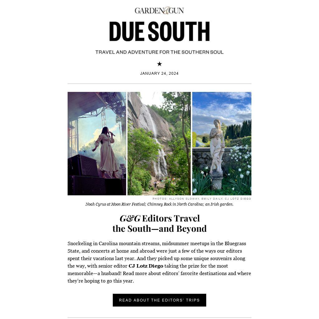 Snorkeling in Carolina mountain streams, midsummer meetups in the Bluegrass State, and concerts at home and abroad were just a few of the ways our editors spent their vacations last year. And they picked up some unique souvenirs along the way, with senior editor CJ Lotz Diego taking the prize for the most memorable—a husband! Read more about editors’ favorite destinations and where they’re hoping to go this year.