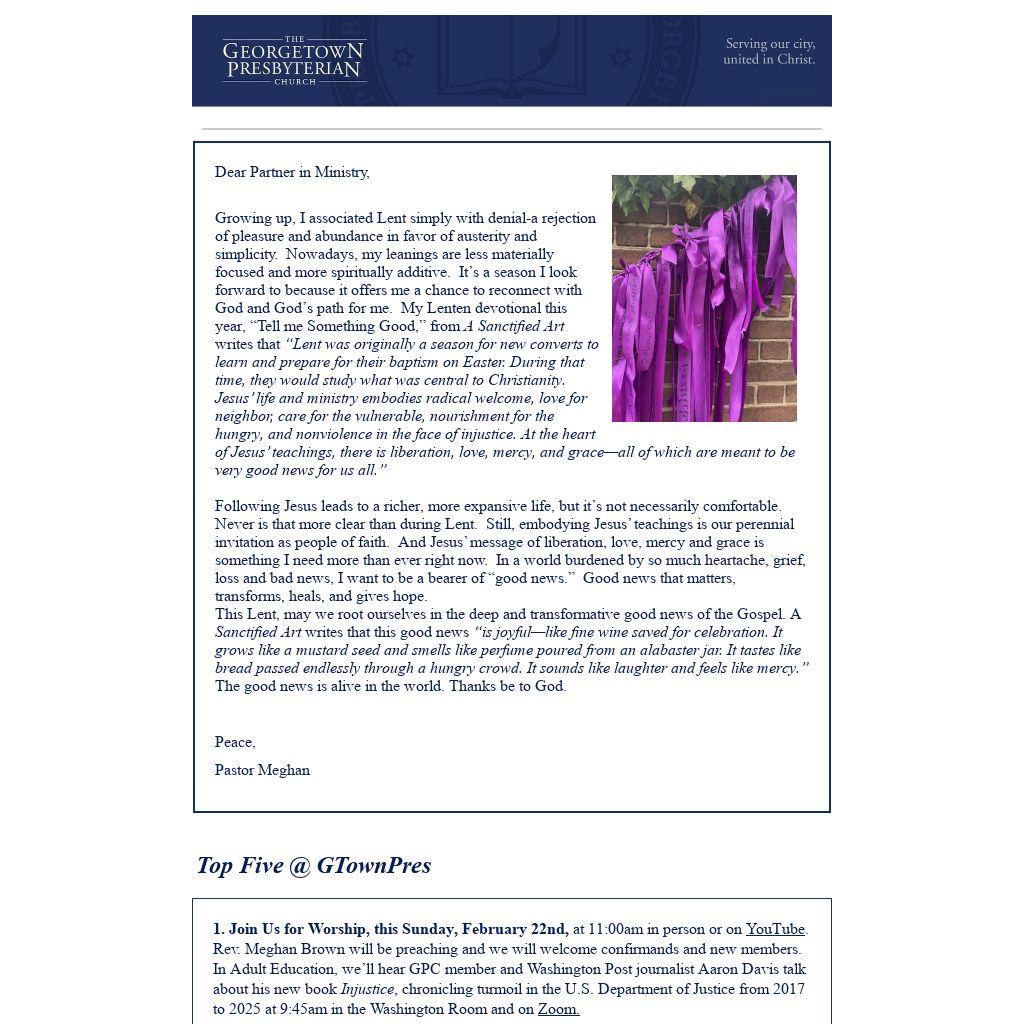 1. Join Us for Worship, this Sunday, February 22nd, at 11:00am in person or on YouTube. Rev. Meghan Brown will be preaching and we will welcome confirmands and new members. In Adult Education, we’ll hear GPC member and Washington Post journalist Aaron Davis talk about his new book Injustice, chronicling turmoil in the U.S. Department of Justice from 2017 to 2025 at 9:45am in the Washington Room and on Zoom.
