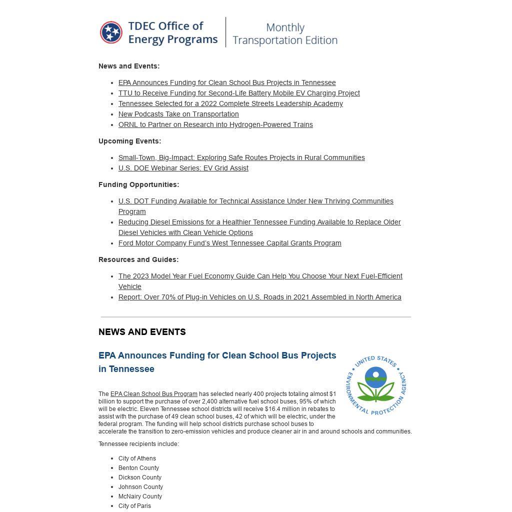 The EPA Clean School Bus Program has selected nearly 400 projects totaling almost $1 billion to support the purchase of over 2,400 alternative fuel school buses, 95% of which will be electric. Eleven Tennessee school districts will receive $16.4 million in rebates to assist with the purchase of 49 clean school buses, 42 of which will be electric, under the federal program. The funding will help school districts purchase school buses to accelerate the transition to zero-emission vehicles and produce cleaner air in and around schools and communities.