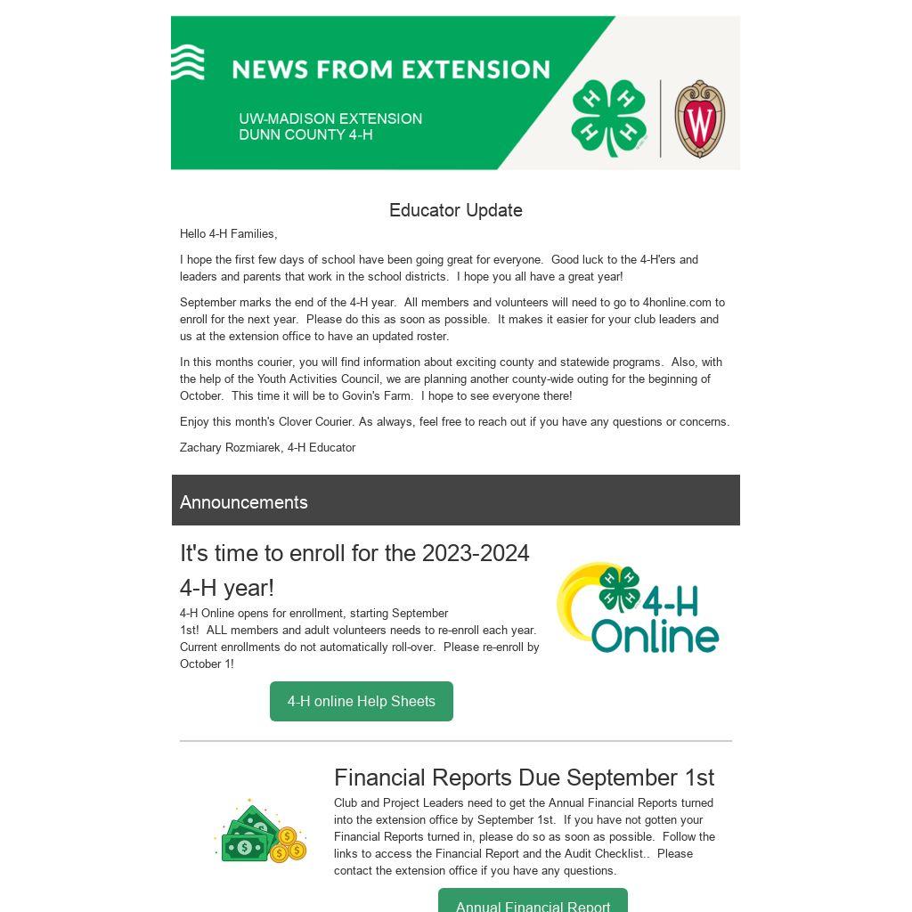 September marks the end of the 4-H year. All members and volunteers will need to go to 4honline.com to enroll for the next year. Please do this as soon as possible. It makes it easier for your club leaders and us at the extension office to have an updated roster.