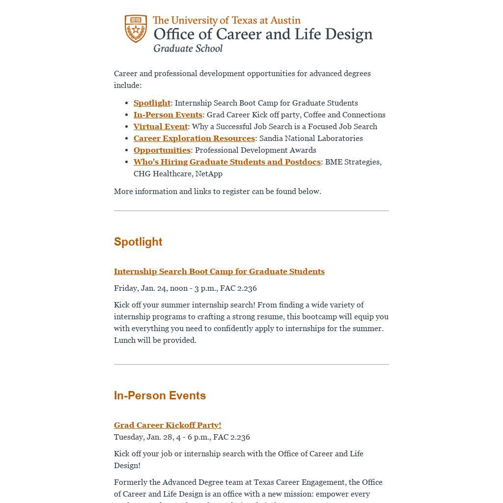 Formerly the Advanced Degree team at Texas Career Engagement, the Office of Career and Life Design is an office with a new mission: empower every graduate student and postdoc to design their future.
