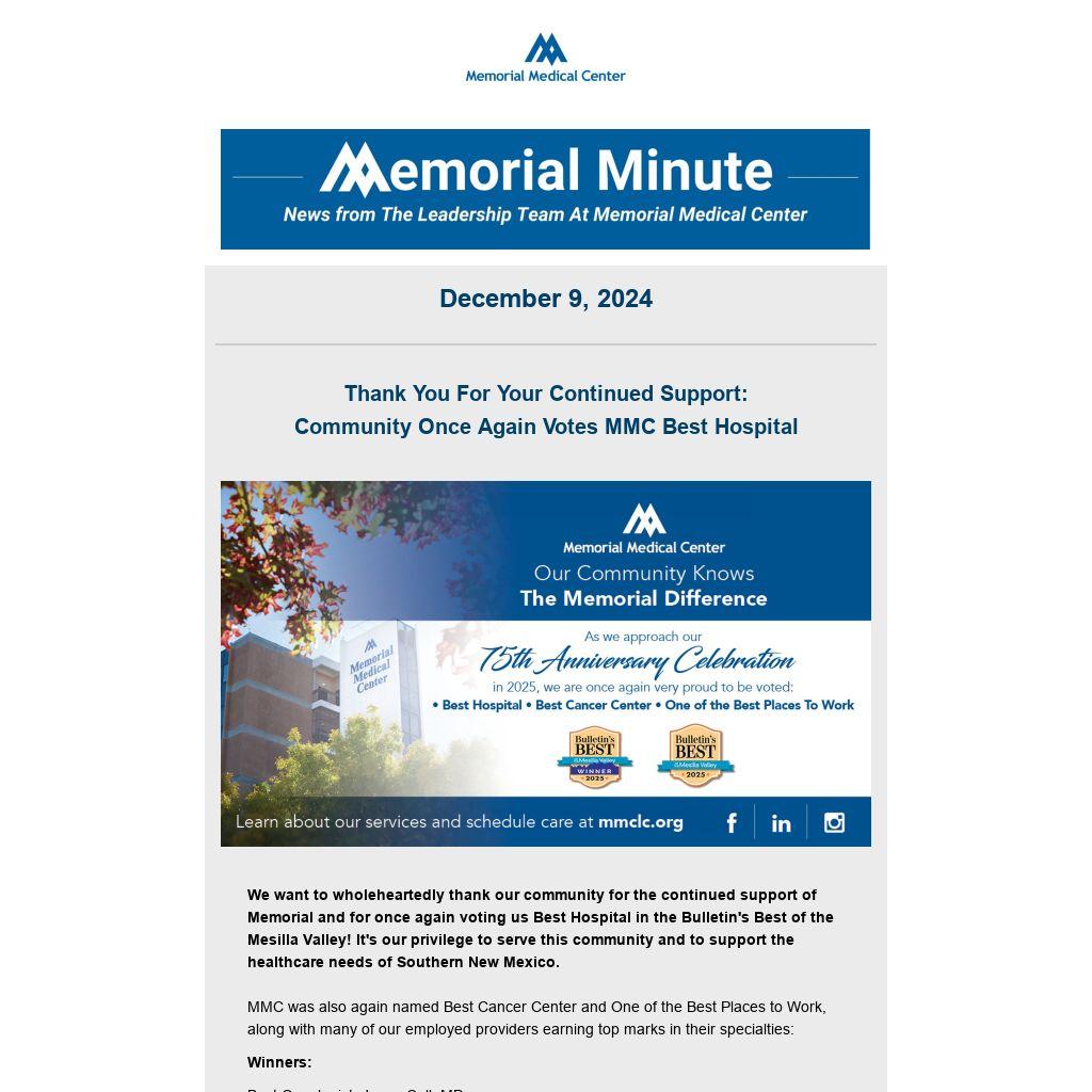 We want to wholeheartedly thank our community for the continued support of Memorial and for once again voting us Best Hospital in the Bulletin's Best of the Mesilla Valley! It's our privilege to serve this community and to support the healthcare needs of Southern New Mexico.