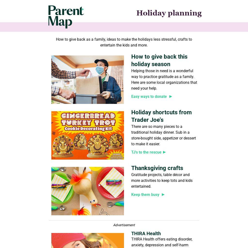 How to give back as a family, ideas to make the holidays less stressful, crafts to entertain the kids and more.