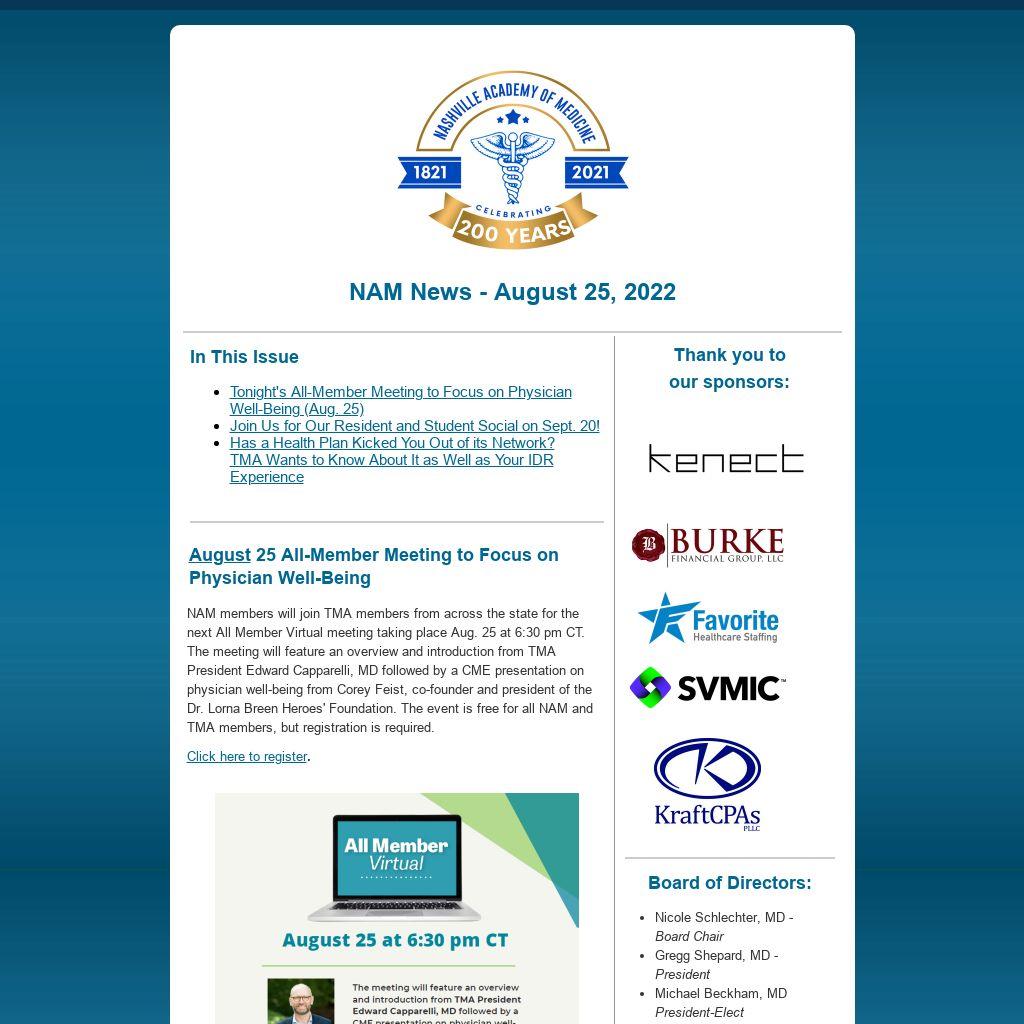 Do you want to learn how to get involved in organized medicine, from the local to the national level? Or, do you just want to know more about the Nashville Academy of Medicine (NAM) and free membership in NAM and TMA for medical students and residents? Join NAM and medical students, residents and fellow leaders from Nashville for all of the above, drinks and light hors d’oeuvres on Tuesday, September 20, from 5:30 to 7:30 p.m.