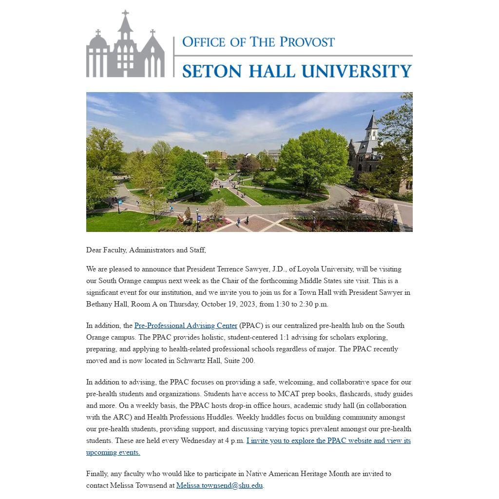 We are pleased to announce that President Terrence Sawyer, J.D., of Loyola University, will be visiting our South Orange campus next week as the Chair of the forthcoming Middle States site visit. This is a significant event for our institution, and we invite you to join us for a Town Hall with President Sawyer in Bethany Hall, Room A on Thursday, October 19, 2023, from 1:30 to 2:30 p.m.