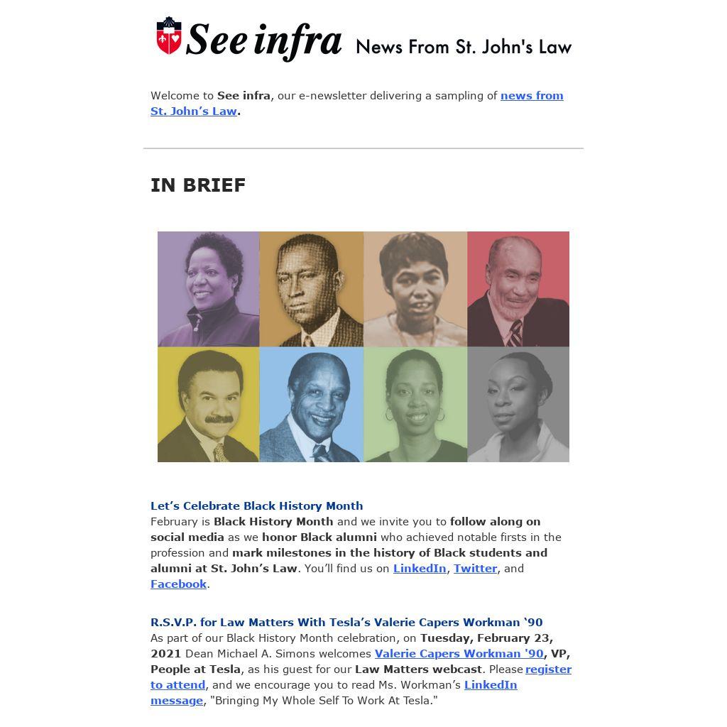 | Let’s Celebrate Black History Month February is Black History Month and we invite you to follow along on social media as we honor Black alumni who achieved notable firsts in the profession and mark milestones in the history of Black students and alumni at St. John’s Law. You’ll find us on LinkedIn, Twitter, and Facebook.