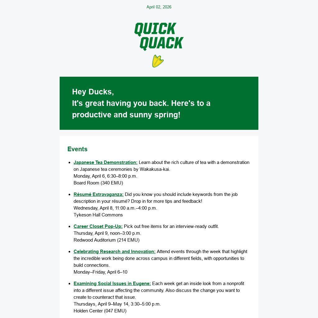 Apply for your degree: Undergrads can apply on DuckWeb by April 26, while grad students can do so on GradWeb by April 10.