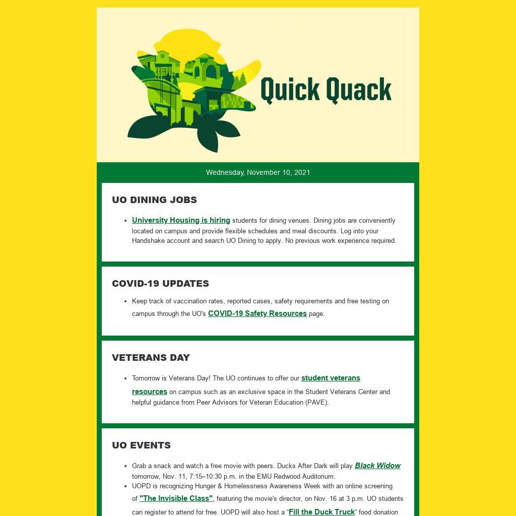 Grab a snack and watch a free movie with peers. Ducks After Dark will play Black Widow tomorrow, Nov. 11, 7:15–10:30 p.m. in the EMU Redwood Auditorium.
