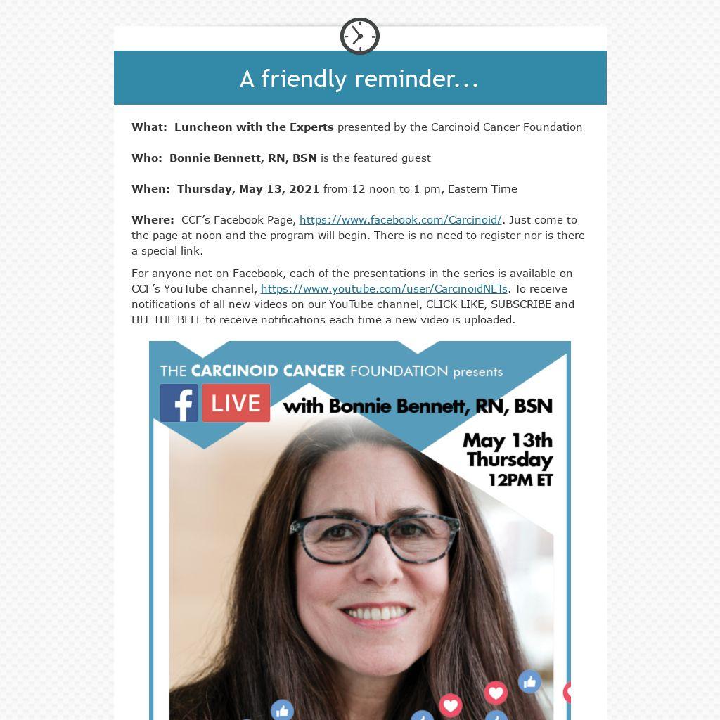 Where: CCF’s Facebook Page, https://www.facebook.com/Carcinoid/. Just come to the page at noon and the program will begin. There is no need to register nor is there a special link.