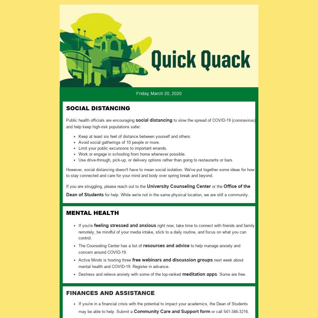 The Dean of Students website has a list of food security resources for students and how they're being impacted by social distancing measures. Check back often for updates.