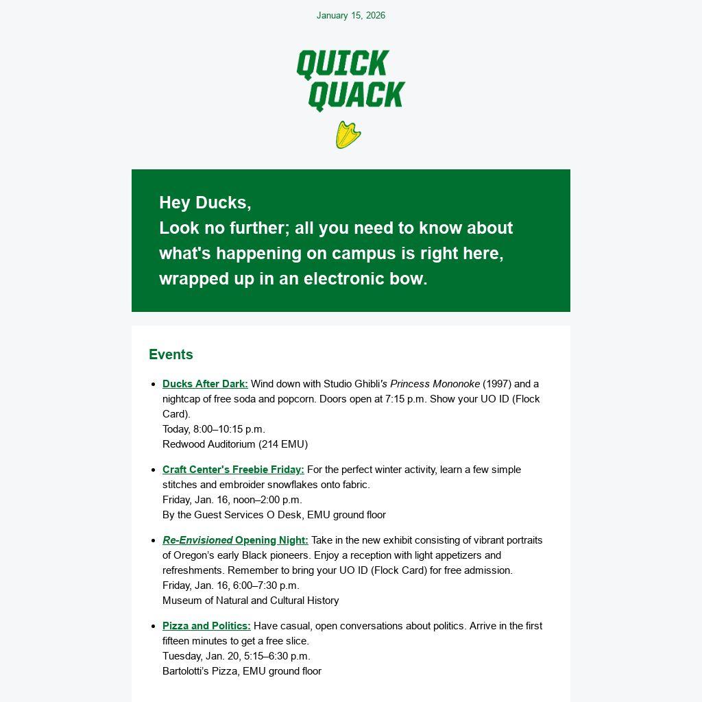 - Ducks After Dark: Wind down with Studio Ghibli's Princess Mononoke (1997) and a nightcap of free soda and popcorn. Doors open at 7:15 p.m. Show your UO ID (Flock Card).