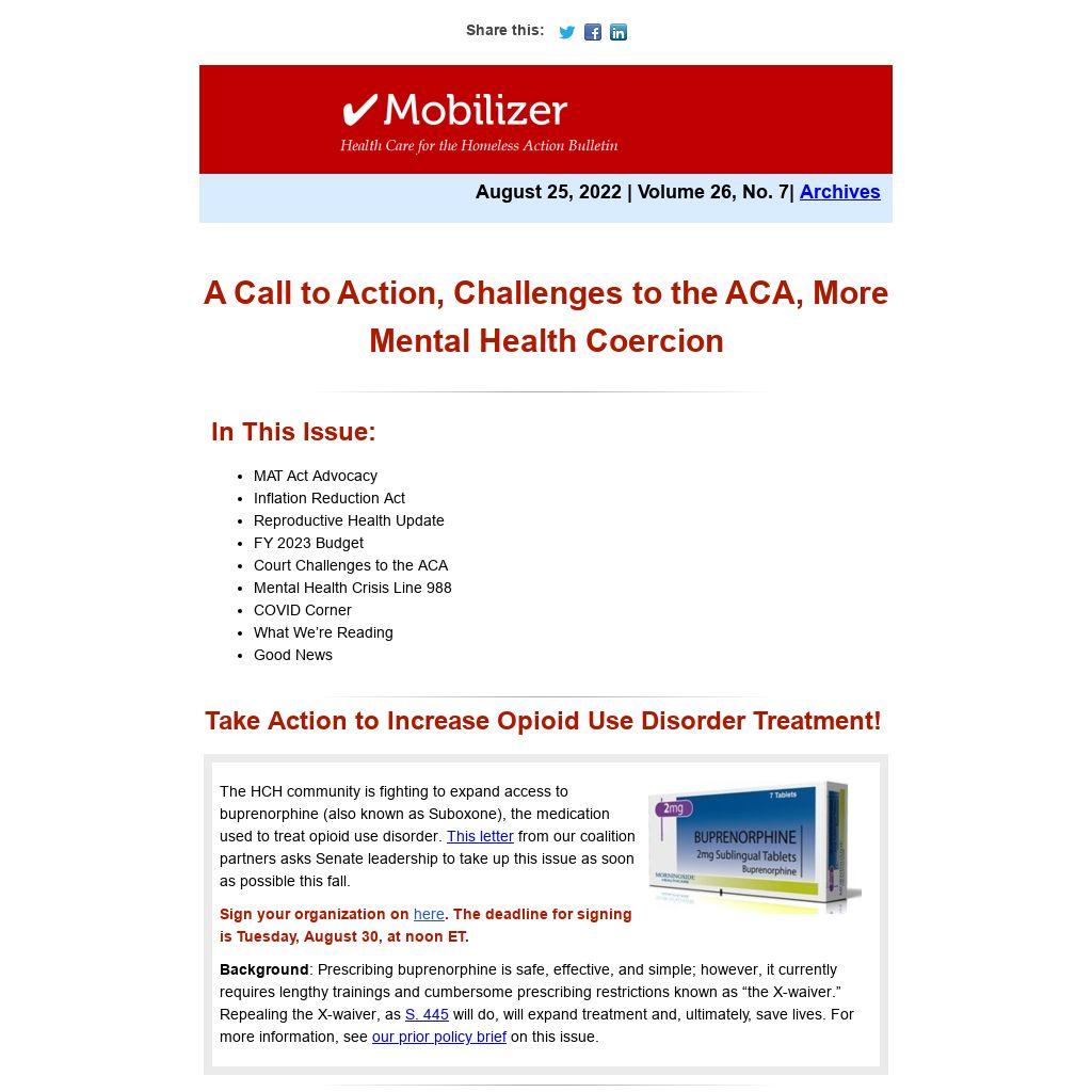 The HCH community is fighting to expand access to buprenorphine (also known as Suboxone), the medication used to treat opioid use disorder. This letter from our coalition partners asks Senate leadership to take up this issue as soon as possible this fall.