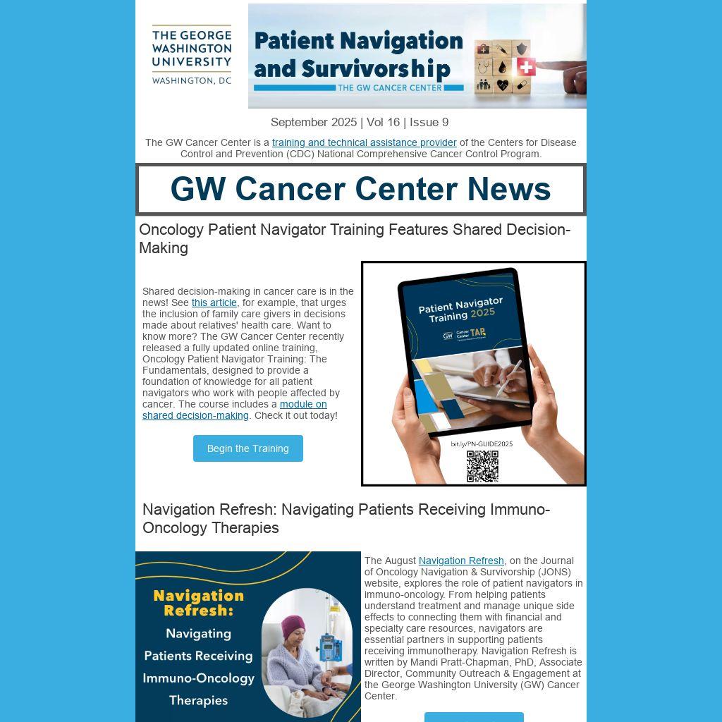 The August Navigation Refresh, on the Journal of Oncology Navigation & Survivorship (JONS) website, explores the role of patient navigators in immuno-oncology. From helping patients understand treatment and manage unique side effects to connecting them with financial and specialty care resources, navigators are essential partners in supporting patients receiving immunotherapy. Navigation Refresh is written by Mandi Pratt-Chapman, PhD, Associate Director, Community Outreach & Engagement at the George Washington University (GW) Cancer Center.
