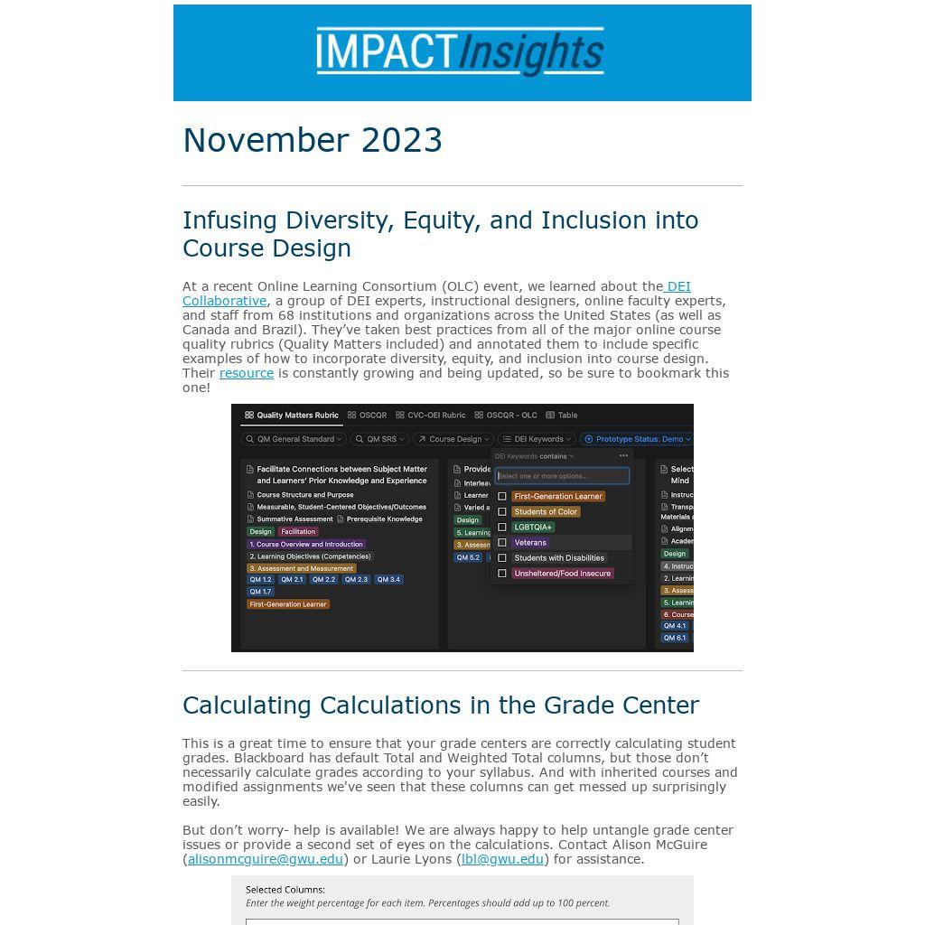But don’t worry- help is available! We are always happy to help untangle grade center issues or provide a second set of eyes on the calculations. Contact Alison McGuire (alisonmcguire@gwu.edu) or Laurie Lyons (lbl@gwu.edu) for assistance.