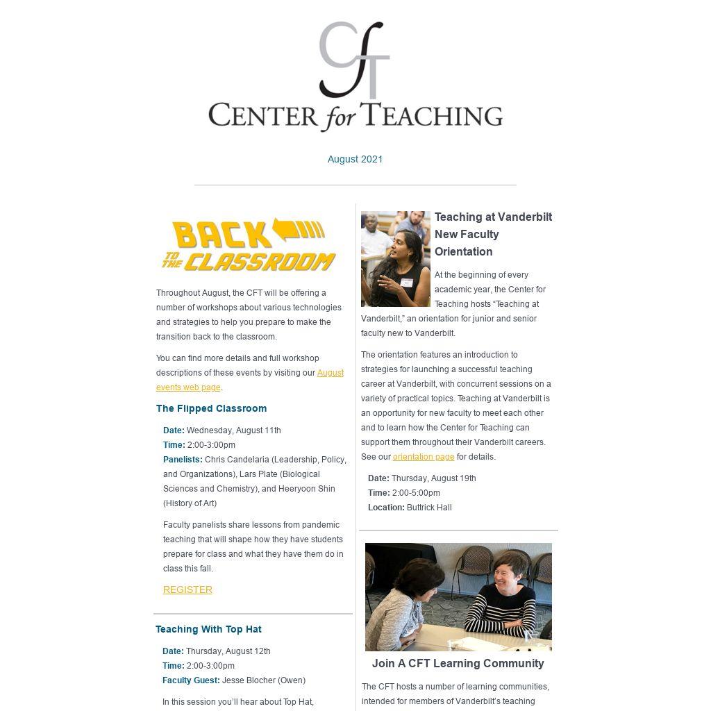 At the beginning of every academic year, the Center for Teaching hosts “Teaching at Vanderbilt,” an orientation for junior and senior faculty new to Vanderbilt.