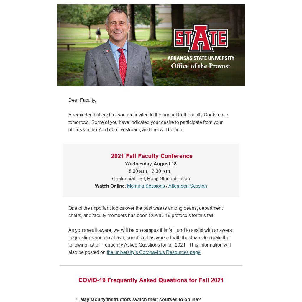 As you are all aware, we will be on campus this fall, and to assist with answers to questions you may have, our office has worked with the deans to create the following list of Frequently Asked Questions for fall 2021. This information will also be posted on the university’s Coronavirus Resources page.