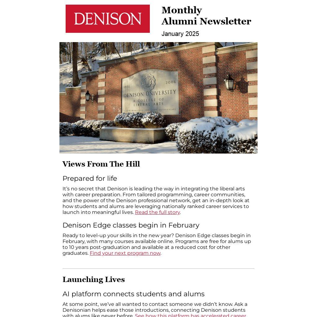 Ready to level-up your skills in the new year? Denison Edge classes begin in February, with many courses available online. Programs are free for alums up to 10 years post-graduation and available at a reduced cost for other graduates. Find your next program now.