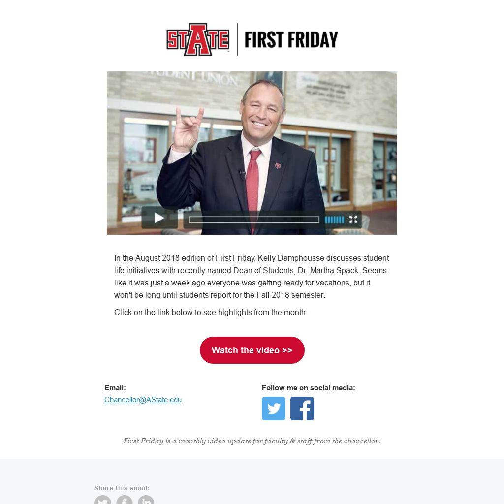 In the August 2018 edition of First Friday, Kelly Damphousse discusses student life initiatives with recently named Dean of Students, Dr. Martha Spack. Seems like it was just a week ago everyone was getting ready for vacations, but it won't be long until students report for the Fall 2018 semester.
