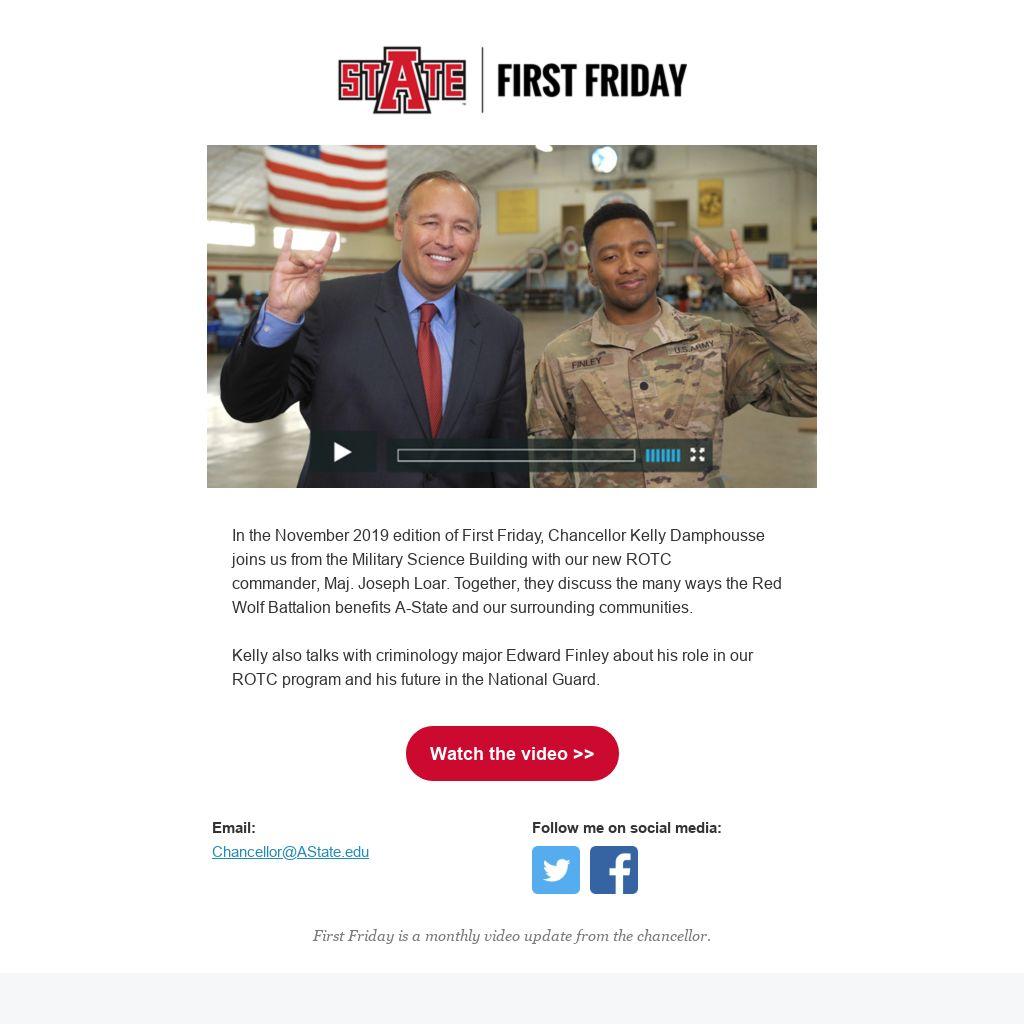 In the November 2019 edition of First Friday, Chancellor Kelly Damphousse joins us from the Military Science Building with our new ROTC commander, Maj. Joseph Loar. Together, they discuss the many ways the Red Wolf Battalion benefits A-State and our surrounding communities.