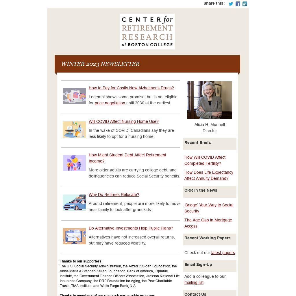 The U.S. Social Security Administration, the Alfred P. Sloan Foundation, the Anna-Maria & Stephen Kellen Foundation, Bank of America, Equable Institute, the Government Finance Officers Association, Jackson National Life Insurance Company, the RRF Foundation for Aging, the Pew Charitable Trusts, TIAA Institute, and Wells Fargo Bank, N.A.
