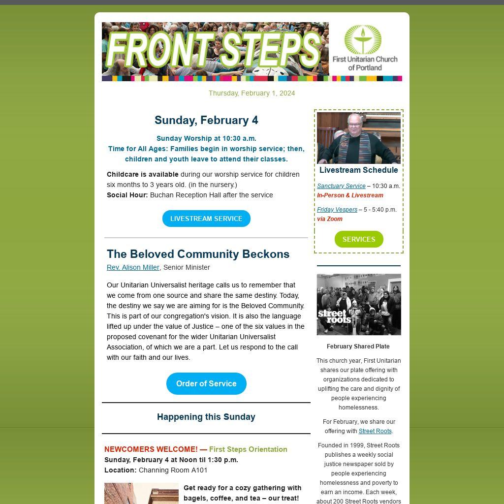 NEWCOMERS WELCOME! — First Steps Orientation Sunday, February 4 at Noon til 1:30 p.m. Location: Channing Room A101