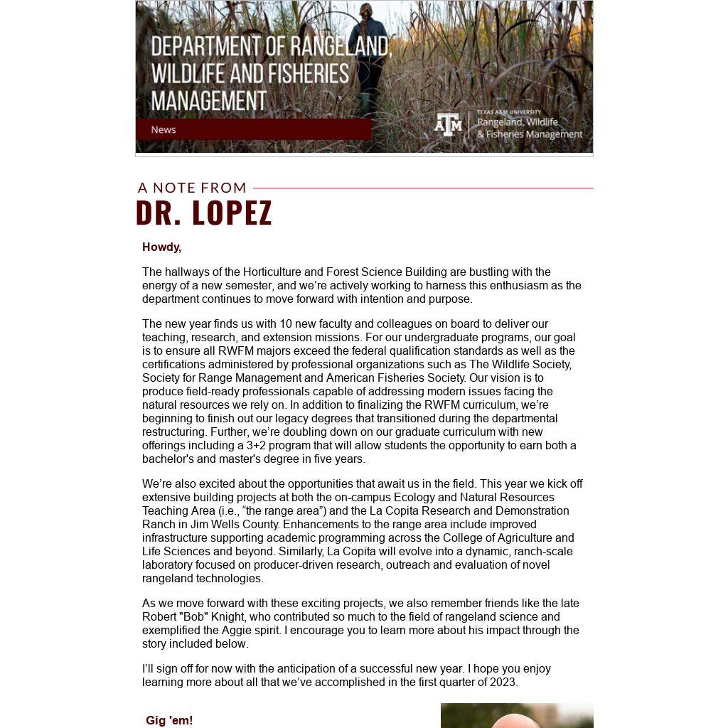 As we move forward with these exciting projects, we also remember friends like the late Robert "Bob" Knight, who contributed so much to the field of rangeland science and exemplified the Aggie spirit. I encourage you to learn more about his impact through the story included below.
