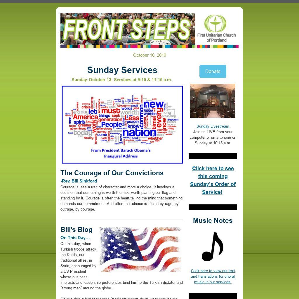 Do You Have an Item for E-news and/or the Sunday Bulletin?If you have an item you’d like published in our weekly Front Steps (eNews) or the Sunday Bulletin, please submit it to: