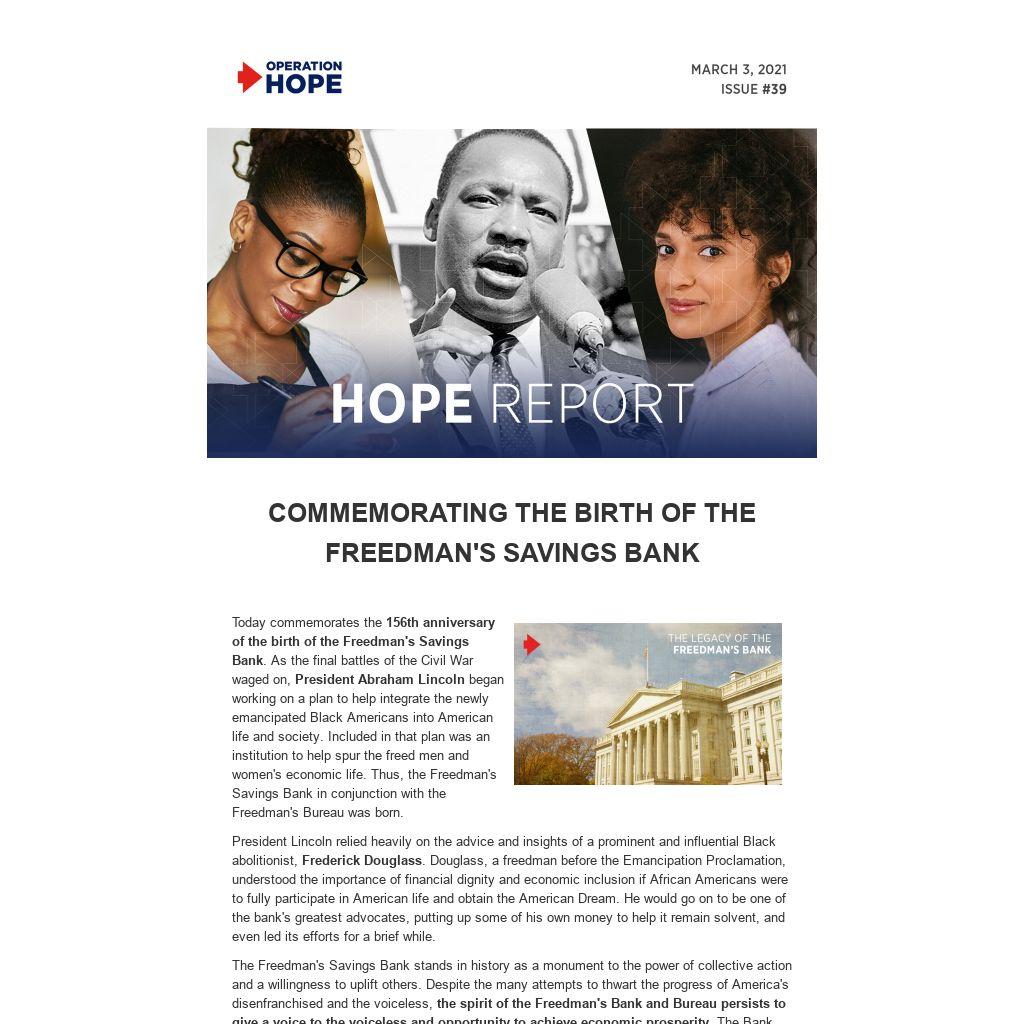 In conjunction with our celebration of the Freedman's Bank, Operation HOPE is proud to announce the launch of our new Operation HOPE Channel, America's Voice for the Economically Underserved. The channel will serve as a repository for HOPE's thought leadership, research, announcements, education, and advocacy surrounding financial equity, inclusion, and uplift of our nation's disenfranchised, unbanked, economically underserved, and the middle-class. The Operation HOPE Channel will become a resource hub for those striving to make the promise of America a reality for themselves and their families and a resource center for allies of the financial dignity movement.