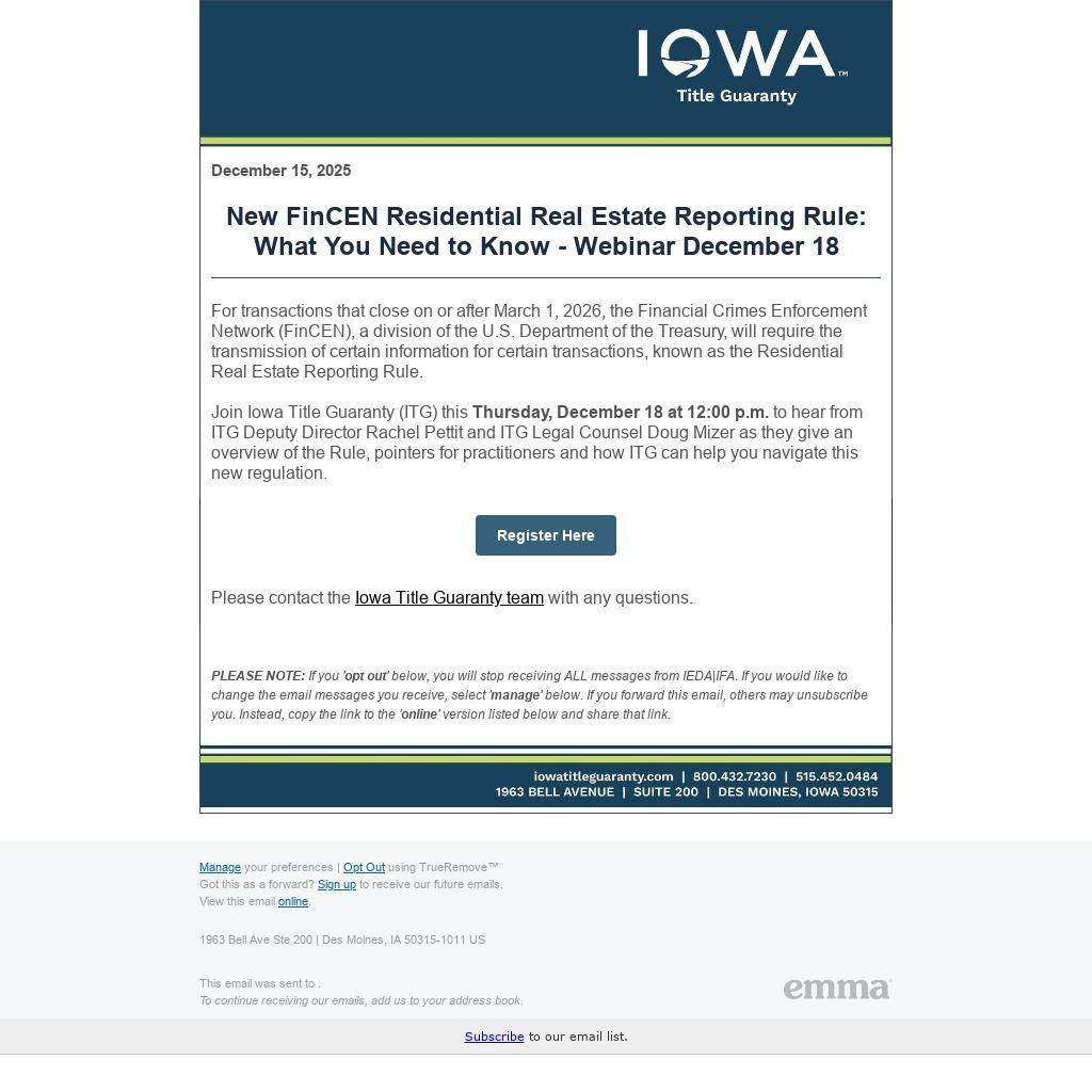 Join Iowa Title Guaranty (ITG) this Thursday, December 18 at 12:00 p.m. to hear from ITG Deputy Director Rachel Pettit and ITG Legal Counsel Doug Mizer as they give an overview of the Rule, pointers for practitioners and how ITG can help you navigate this new regulation.