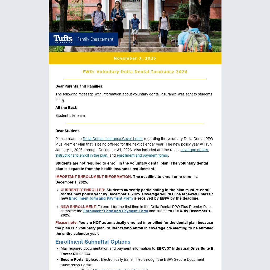 CURRENTLY ENROLLED: Students currently participating in the plan must re-enroll for the new policy year by December 1, 2025. Coverage will NOT be renewed unless a new Enrollment form and Payment Form is received by EBPA by the deadline.
