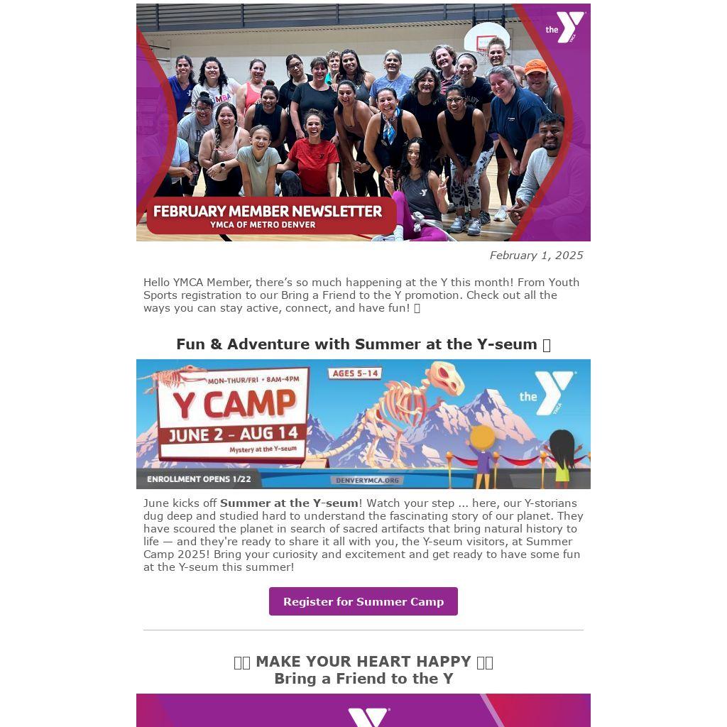 Hello YMCA Member, thereβs so much happening at the Y this month! From Youth Sports registration to our Bring a Friend to the Y promotion. Check out all the ways you can stay active, connect, and have fun! π
