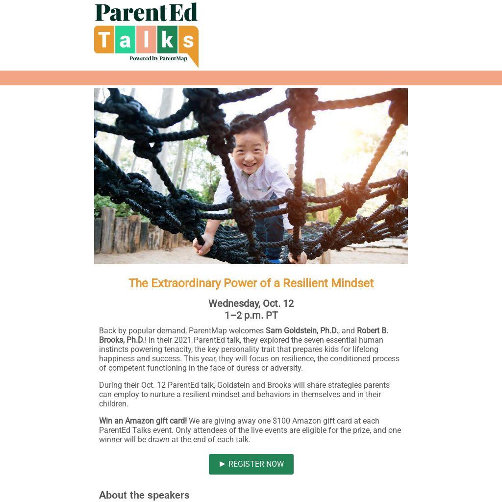 Win an Amazon gift card! We are giving away one $100 Amazon gift card at each ParentEd Talks event. Only attendees of the live events are eligible for the prize, and one winner will be drawn at the end of each talk.