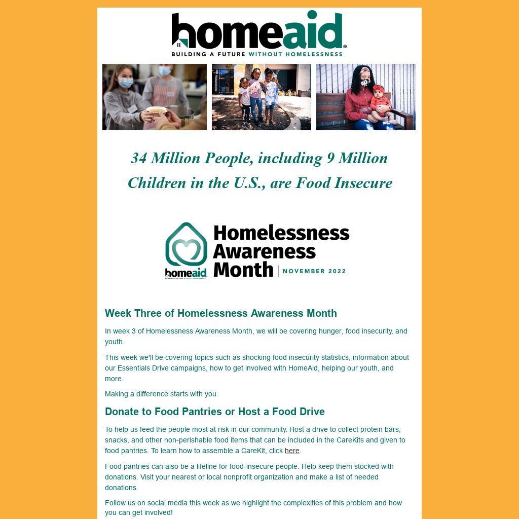 This week we'll be covering topics such as shocking food insecurity statistics, information about our Essentials Drive campaigns, how to get involved with HomeAid, helping our youth, and more.