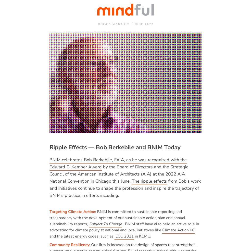 mindful - As a perfect mirror reflection of the letters bnim, mindful is this place for communication, where we reflect upon projects, people and events to share beyond the firm’s walls. To subscribe, please click here.