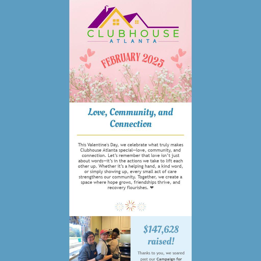 This Valentine's Day, we celebrate what truly makes Clubhouse Atlanta special—love, community, and connection. Let’s remember that love isn’t just about words—it’s in the actions we take to lift each other up. Whether it’s a helping hand, a kind word, or simply showing up, every small act of care strengthens our community. Together, we create a space where hope grows, friendships thrive, and recovery flourishes. ❤️