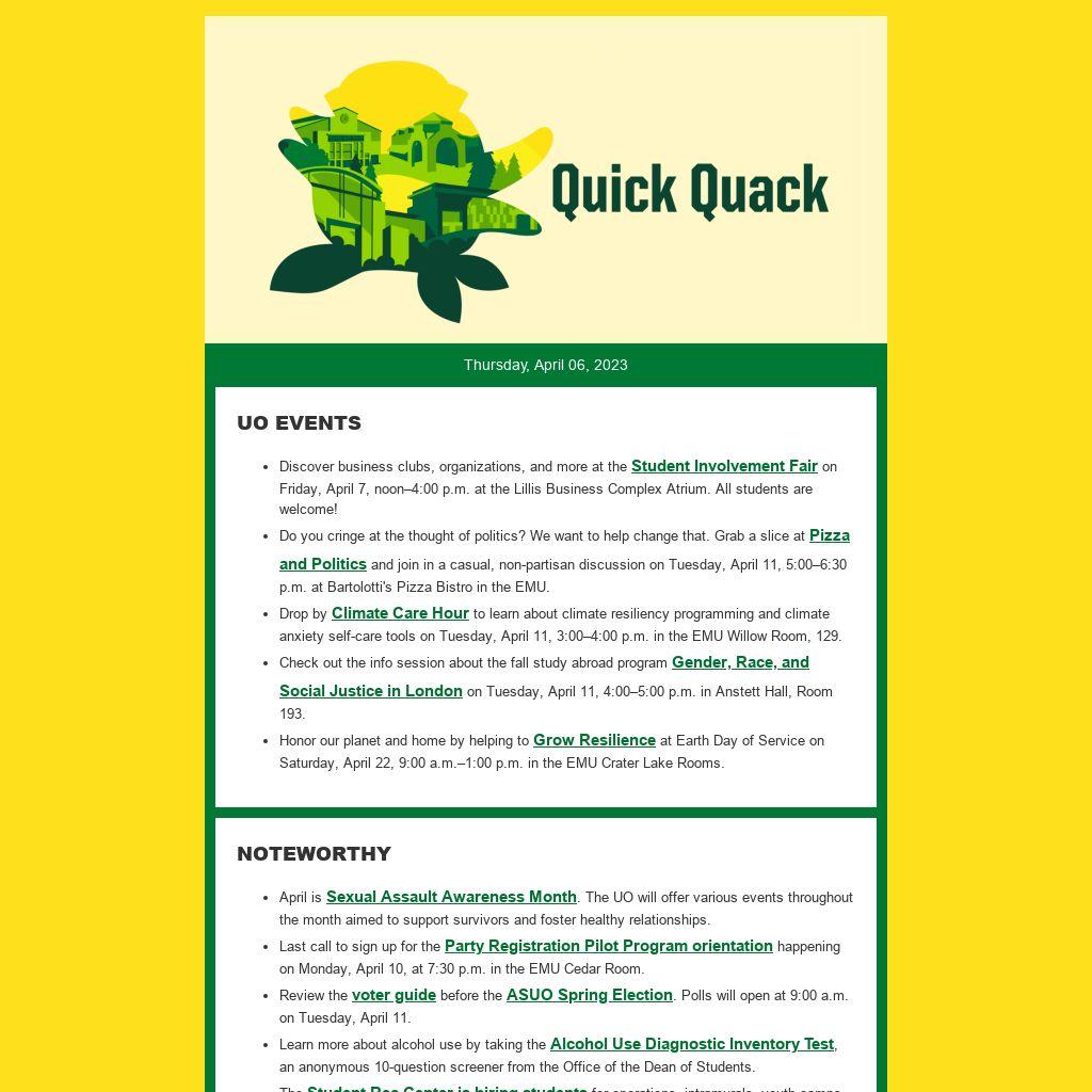 - Discover business clubs, organizations, and more at the Student Involvement Fair on Friday, April 7, noon–4:00 p.m. at the Lillis Business Complex Atrium. All students are welcome!