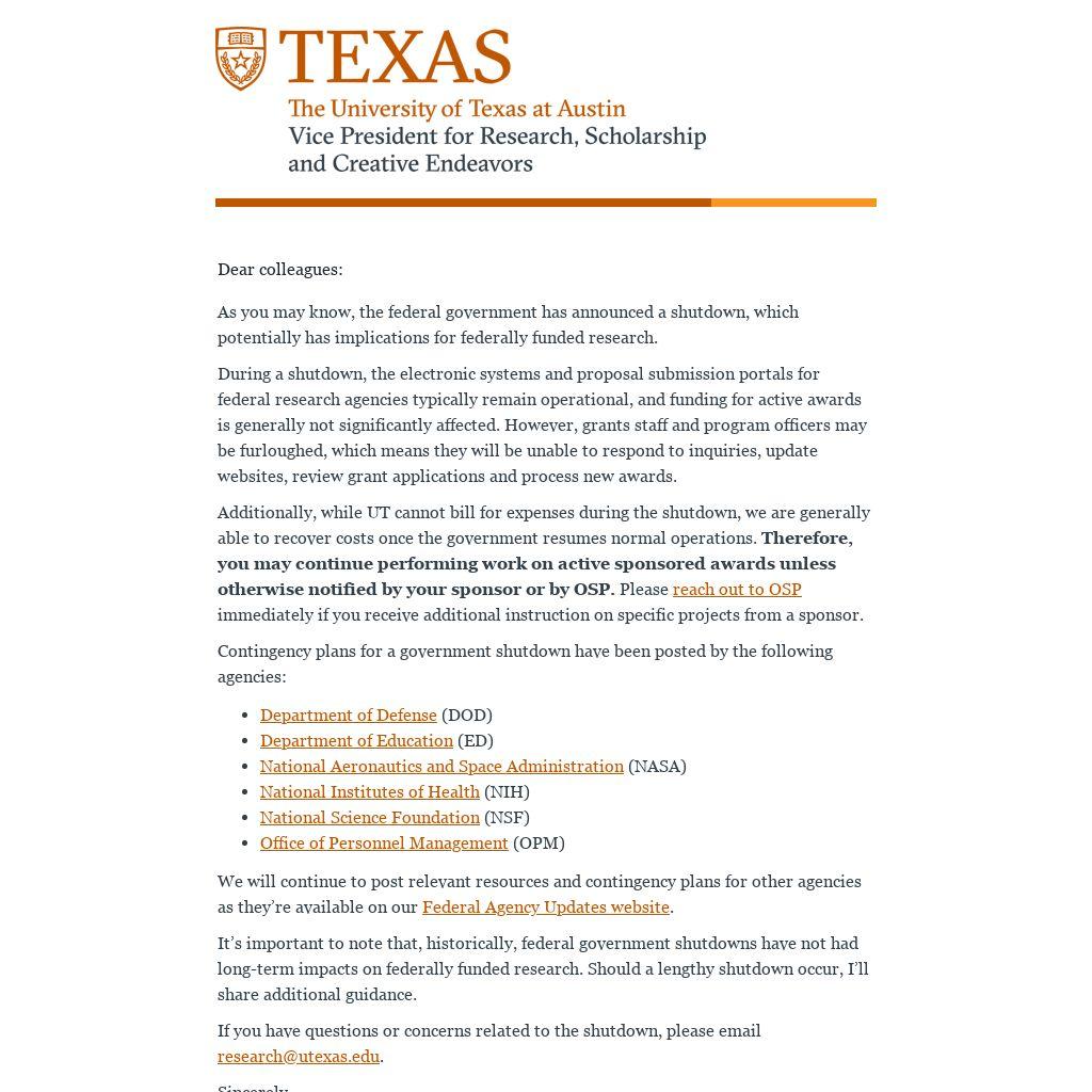 Additionally, while UT cannot bill for expenses during the shutdown, we are generally able to recover costs once the government resumes normal operations. Therefore, you may continue performing work on active sponsored awards unless otherwise notified by your sponsor or by OSP. Please reach out to OSP immediately if you receive additional instruction on specific projects from a sponsor.