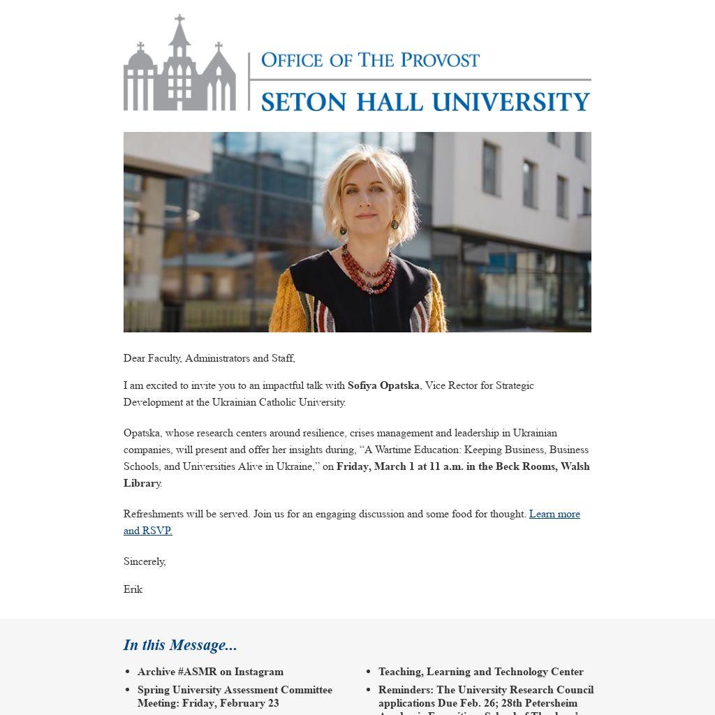 Opatska, whose research centers around resilience, crises management and leadership in Ukrainian companies, will present and offer her insights during, “A Wartime Education: Keeping Business, Business Schools, and Universities Alive in Ukraine,” on Friday, March 1 at 11 a.m. in the Beck Rooms, Walsh Library.