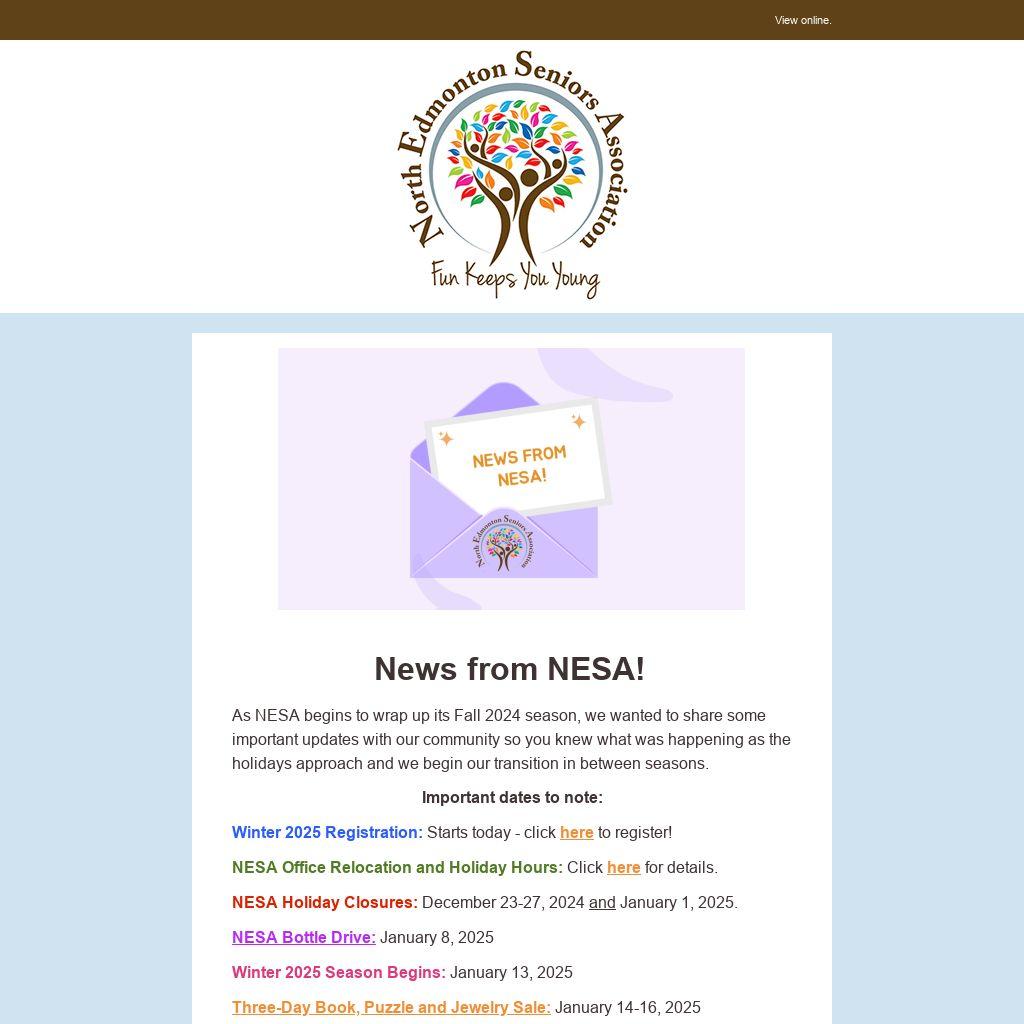 NESA Holiday Closures: December 23-27, 2024 and January 1, 2025.