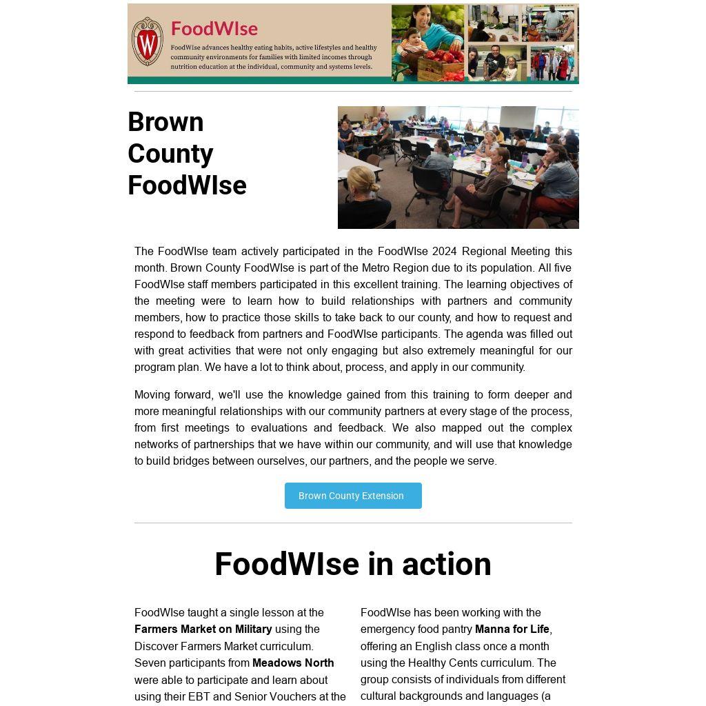 The FoodWIse team actively participated in the FoodWIse 2024 Regional Meeting this month. Brown County FoodWIse is part of the Metro Region due to its population. All five FoodWIse staff members participated in this excellent training. The learning objectives of the meeting were to learn how to build relationships with partners and community members, how to practice those skills to take back to our county, and how to request and respond to feedback from partners and FoodWIse participants. The agenda was filled out with great activities that were not only engaging but also extremely meaningful for our program plan. We have a lot to think about, process, and apply in our community.