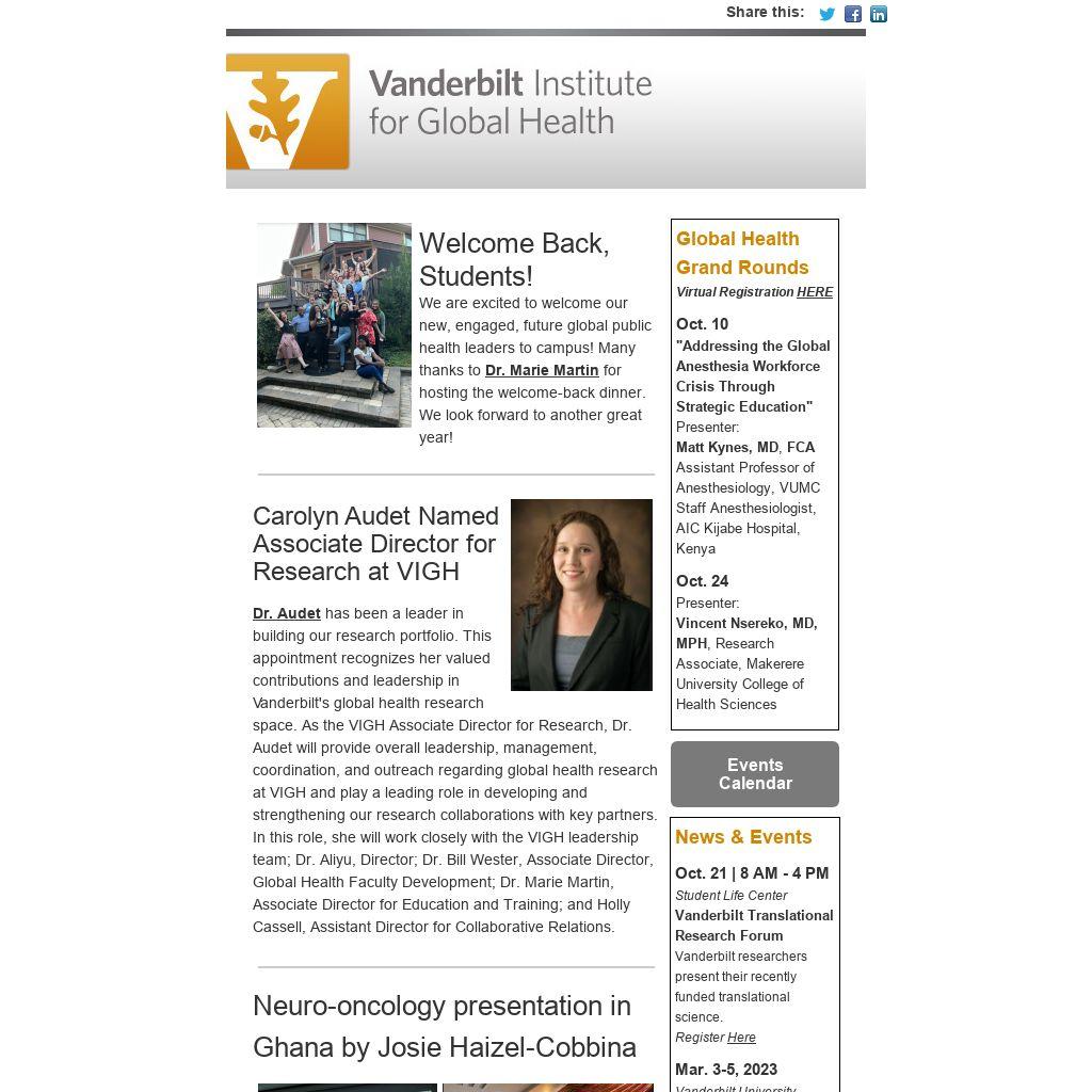 Dr. Audet has been a leader in building our research portfolio. This appointment recognizes her valued contributions and leadership in Vanderbilt's global health research space. As the VIGH Associate Director for Research, Dr. Audet will provide overall leadership, management, coordination, and outreach regarding global health research at VIGH and play a leading role in developing and strengthening our research collaborations with key partners. In this role, she will work closely with the VIGH leadership team; Dr. Aliyu, Director; Dr. Bill Wester, Associate Director, Global Health Faculty Development; Dr. Marie Martin, Associate Director for Education and Training; and Holly Cassell, Assistant Director for Collaborative Relations.