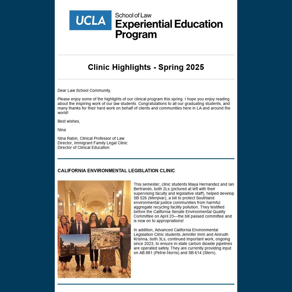 Please enjoy some of the highlights of our clinical program this spring. I hope you enjoy reading about the inspiring work of our law students. Congratulations to all our graduating students, and many thanks for their hard work on behalf of clients and communities here in LA and around the world!