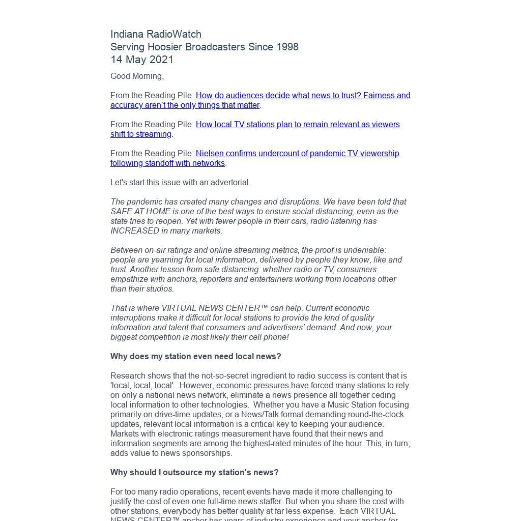 Of course, VIRTUAL NEWS CENTER™ can do the normal beat calls and web site checks. We also get on relevant email and fax distribution lists for your station. In a Corona world, we've seen that technology makes it simple for virtually every staffer to work from outside the building. In many situations, traffic and billing is handled somewhere else, and now you can have a larger sounding newsroom and not worry about all the issues that go along with a local hire.