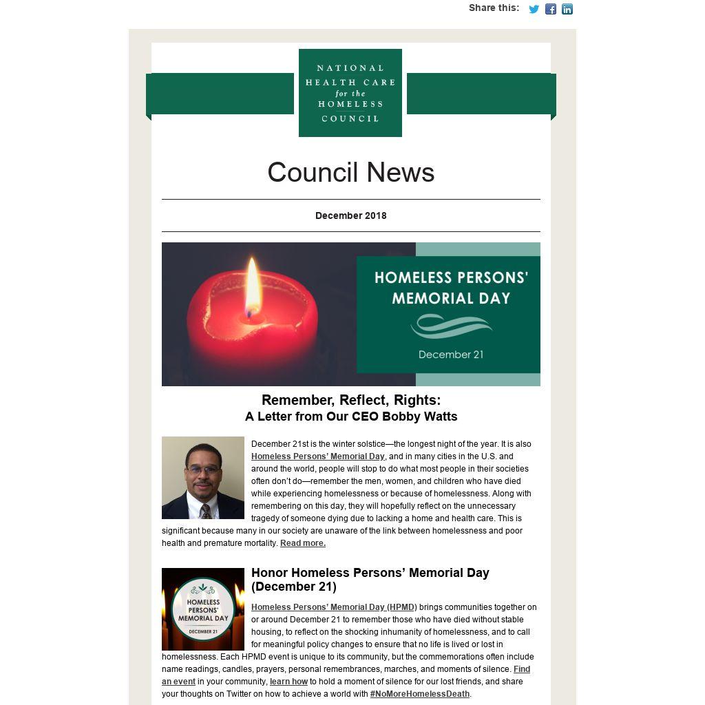 | Honor Homeless Persons’ Memorial Day (December 21) Homeless Persons’ Memorial Day (HPMD) brings communities together on or around December 21 to remember those who have died without stable housing, to reflect on the shocking inhumanity of homelessness, and to call for meaningful policy changes to ensure that no life is lived or lost in homelessness. Each HPMD event is unique to its community, but the commemorations often include name readings, candles, prayers, personal remembrances, marches, and moments of silence. Find an event in your community, learn how to hold a moment of silence for our lost friends, and share your thoughts on Twitter on how to achieve a world with #NoMoreHomelessDeath.